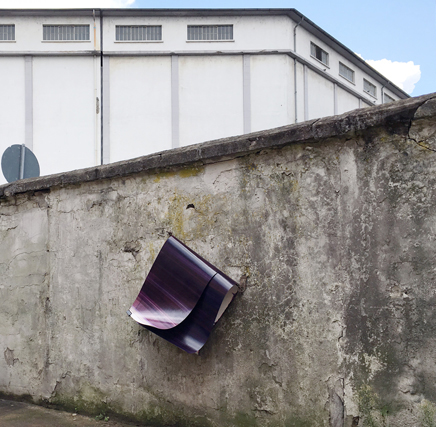 Andererseits nützlich | vorgefundene Halterungen mit Stange, 70 cm, und 2x Öl und Lack auf Papier, je 140 x 55 cm, foldback clip, Hofmauer, export 33, Dortmund, 2.9.2017 (Foto: Christian Gode)