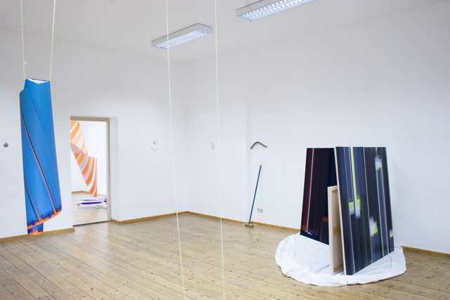 plus minus | Schrubber, Papprest, Tyvek, Öl auf Leinwand je 145x145 cm (2017, dahinter 2009) und 100x100 cm (2018), hängend: Öl auf Papier 110x220 cm (2019), galerie weisser elefant, Berlin, 28.6. - 27.7.2019