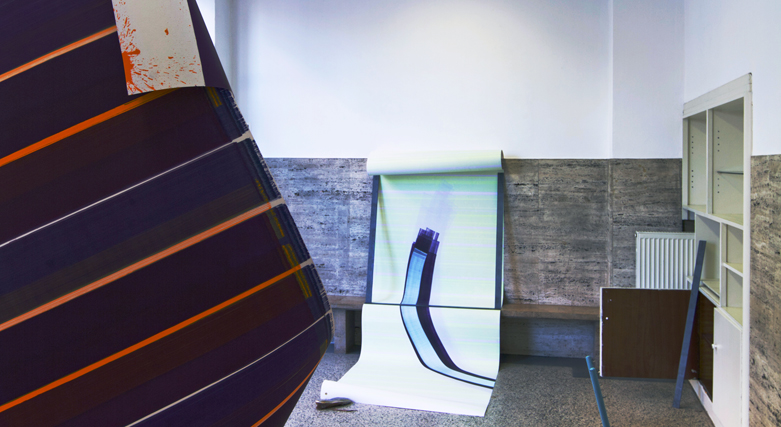 Rollbild82 resonar | Öl auf Papier 110x650/440 cm, Bandeisen, Arbeitsschuh, ehemaliger Blumenladen | Vorübergehend - in Farbe #7, Hammerschmidt und Gladigau, Erfurt, 1.2. - 19.4.2020 (Foto: Denis Bury)