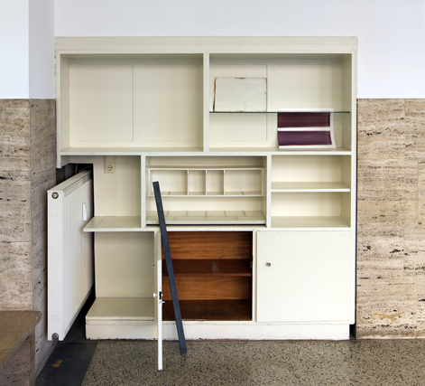 Rollbild82 resonar | Einbauschrank ehemaliger Blumenladen, Bandeisen 110x5 cm, Staub, gefundenes Brett, Gouache auf Papier 42x23 cm | Vorübergehend - in Farbe #7, Hammerschmidt und Gladigau, Erfurt, 1.2. - 19.4.2020 (Foto: Denis Bury)