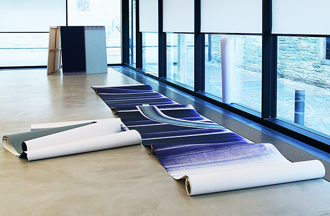 Rollbild100 Grüne Werte Metamorphose I | Öl auf Papier je 110 x 460-900 cm und je 125 x 250-1000 cm, Nylonschnur, Bandeisen, Grünsandsteine, Werkzeuge, Reste | Raum Schroth im Museum Morgner, Soest, 1.8. - 31.10.2021 (Foto: Stefanie Nafé)